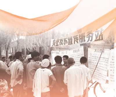 1981年9月,河北临西县实行包产到户后,农技推广站在集上销售种子、农药,许多农民前来咨询农业技术问题。蒋 铎摄(影像中国)